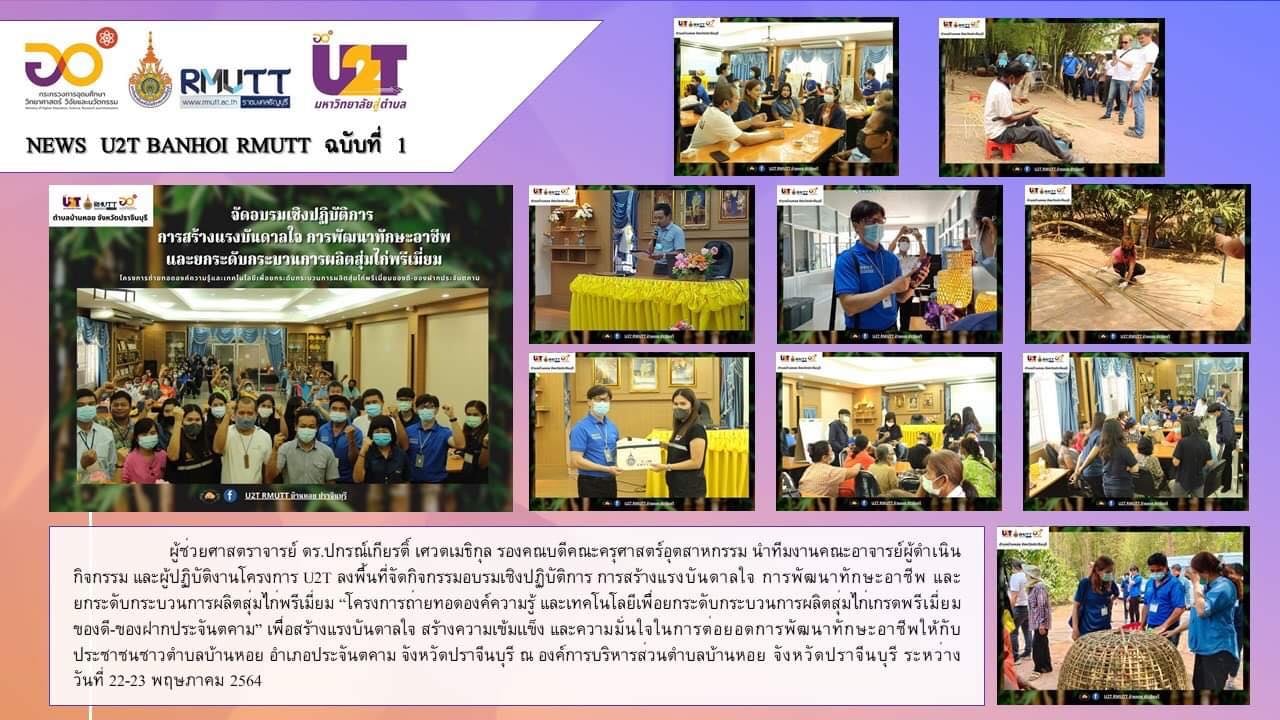 กิจกรรมทั้งหมด December 19, 2021 ลงพื้นที่จัดกิจกรรมอบรมเชิงปฎิบัติการ "มัคคุเทศก์ท้องถิ่น และเทคนิคการนำเสนอผลิตภัณฑ์สู่การจำหน่ายเชิงพาณิชย์" December 19, 2021 ลงพื้นที่จัดกิจกรรมอบรมเชิงปฎิบัติการ การวิเคราะห์สถานภาพเศรษฐกิจในชีวิตประจำวัน เพื่อยกระดับรายได้สุ่มไก่พรีเมียม November 3, 2021 พิธีเปิดศูนย์การเรียนรู้วิสาหกิจหัตถกรรมจักสานไม้ไผ่ตำบลบ้านหอย October 8, 2021 ลงพื้นที่จัดกิจกรรมอบรมเชิงปฏิบัติการ หัวข้อ “เทคนิคการพัฒนาสื่อประชาสัมพันธ์ออนไลน์” October 7, 2021 ลงพื้นที่จัดกิจกรรมอบรมเชิงปฏิบัติการ เรื่อง การป้องกันมอด-แมลง และการรักษาคุณภาพของไผ่ในกระบวนการเพาะปลูก July 24, 2021 สร้าง U2T RMUTT บ้านหอย ปราจีนบุรี Facebook Page June 23, 2021 กิจกรรมย่อยที่ 2.1 การลงพื้นที่สร้างศูนย์การเรียนรู้ และแหล่งท่องเที่ยวนวัตวิถีชุมชน June 20, 2021 บริษัท วงศ์ไผ่ จำกัด มอบต้นแบบเตาเผาความร้อนสูง จำนวน 1 เตา แก่กลุ่มไผ่จักสานวิสาหกิจชุมชนตำบลบ้านหอย June 17, 2021 กิจกรรมย่อย 1.1 อบรมเชิงปฏิบัติการ การสร้างแรงบันดาลใจ การพัฒนาทักษะอาชีพ และยกระดับกระบวนการผลิตสุ่มไก่พรีเมี่ยม February 14, 2021 กิจกรรมเพิ่มเติมลงพื้นที่สำรวจ เก็บข้อมูล ของภาคประชาชน