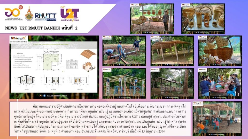 ทีมงานคณะอาจารย์ผู้ดำเนินกิจกรรมโครงการถ่ายทอดองค์ความรู้ และเทคโนโลยีเพื่อยกระดับกระบวนการผลิตสุ่มไก่เกรดพรีเมี่ยมของดี-ของฝากประจันตคาม โดย ดร.เยาวลักษณ์ พิพัฒน์จำเริญกุล ดร.กัลยาณี เจริญนุช ช่างมี นายณัฐกิตติ์ ชิณะพงษ์เจริญ และผู้ปฏิบัติงานโครงการ U2T ลงพื้นที่จัดกิจกรรมอบรมเชิงปฏิบัติการ“มัคคุเทศก์ท้องถิ่น และเทคนิคการนำเสนอผลิตภัณฑ์สู่การจำหน่ายเชิงพาณิชย์” มีการถ่ายทอดองค์ความรู้และบูรณาการ เรื่อง การถ่ายภาพ การออกแบบโลโก้ผลิตภัณฑ์ด้วยโปรแกรมออกแบบ เพื่อสร้างอัตลักษ์สินค้า เพื่อช่วยเพิ่มจุดสนใจให้กับสินค้าที่สามารถทำได้ในครอบครัว ให้แก่เยาวชนรุ่นใหม่และประชาชนในพื้นที่ ระหว่างวันที่ 2-3 ธันวาคม 2564 ณ โรงเรียนวัดบ้านโนน ตำบลดงบัง จังหวัดปราจีนบุรี